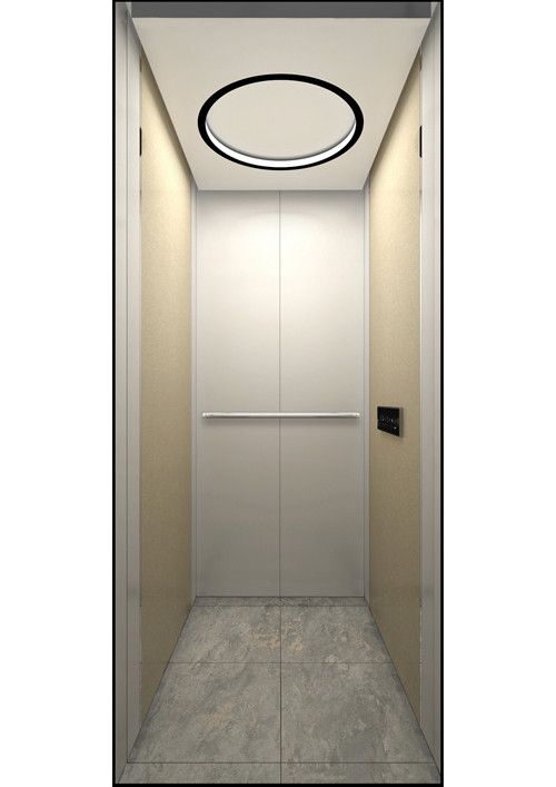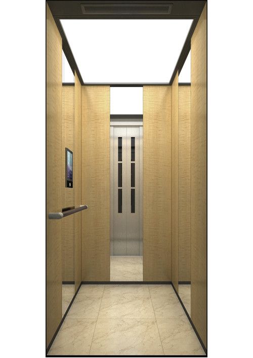 天井:噴砂不銹鋼  后側:彩紋鋼板浮雕木紋+鏡面不銹鋼  左右:彩紋鋼板浮雕木紋+彩紋鋼板大理石紋+鏡面飾條  前側+轎門:香檳金鏡面  地板:PVC大理石紋