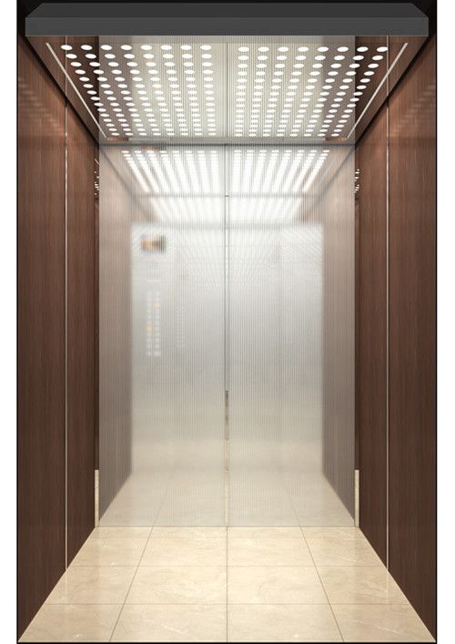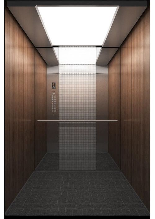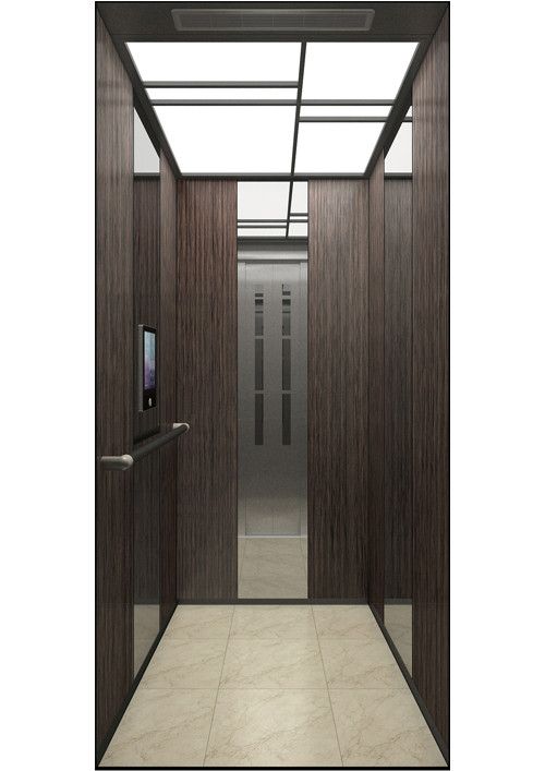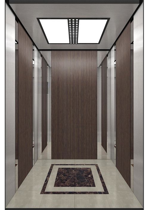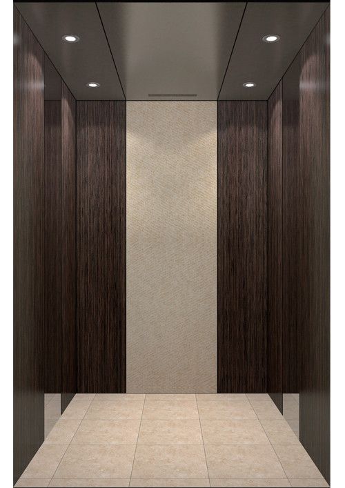 轎廂型號:YG-1625  天井:鉆石銀噴涂鋼板(YG-11)  兩側、后側板:兩側杉木紋彩紋鋼板(KB-02)+鏡面不銹鋼飾條+深咖色砂紋烤漆板(YG-08)  前側板、門楣:緞紋不銹鋼  轎門:緞紋不銹鋼  地板:FL-P31(砂巖米黃PVC)  操作盤:BC-D2F2