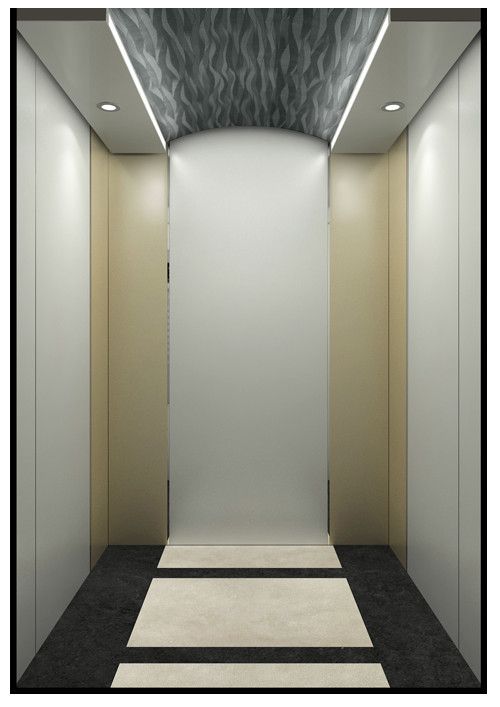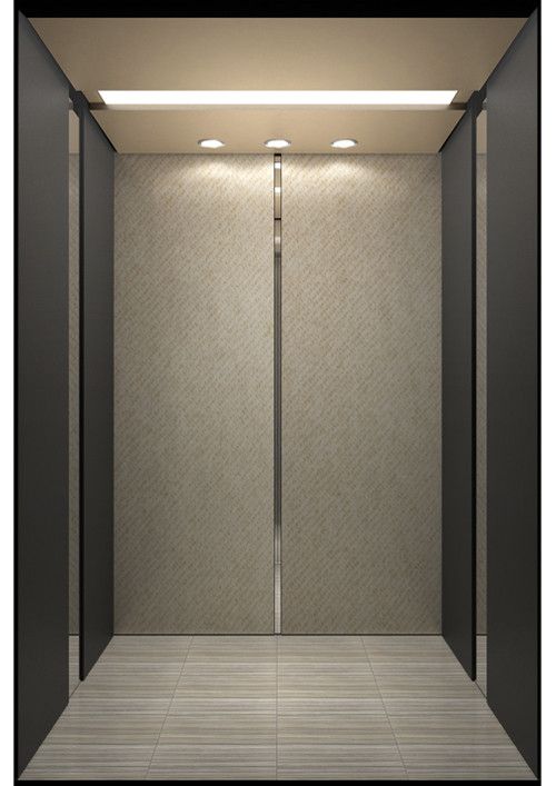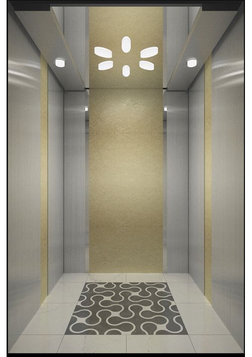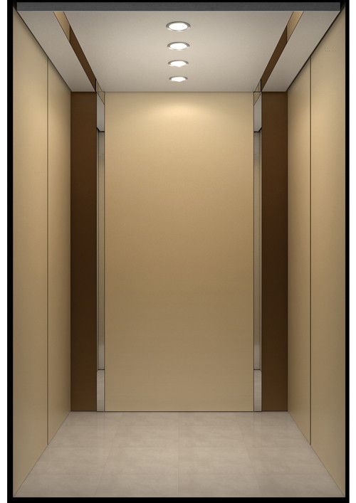 轎廂型號:YG-1622  天井:白色砂紋噴漆板(YG-05)+鏡面不銹鋼  兩側、后側板:兩側香檳色砂紋鋼板(YG-07),后側香檳色砂紋鋼板(YG-07)+深咖色砂紋烤漆板(YG-08)+鏡面飾條  前側板、門楣:緞紋不銹鋼  轎門:緞紋不銹鋼  地板:FL-P34(米黃PVC)  操作盤:BD-D2F1