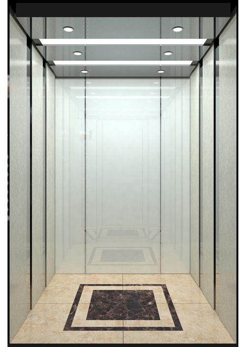 天井:噴砂不銹鋼  后側:彩紋鋼板浮雕木紋+鏡面不銹鋼  左右:彩紋鋼板浮雕木紋+彩紋鋼板大理石紋+鏡面飾條  前側+轎門:香檳金鏡面  地板:PVC大理石紋