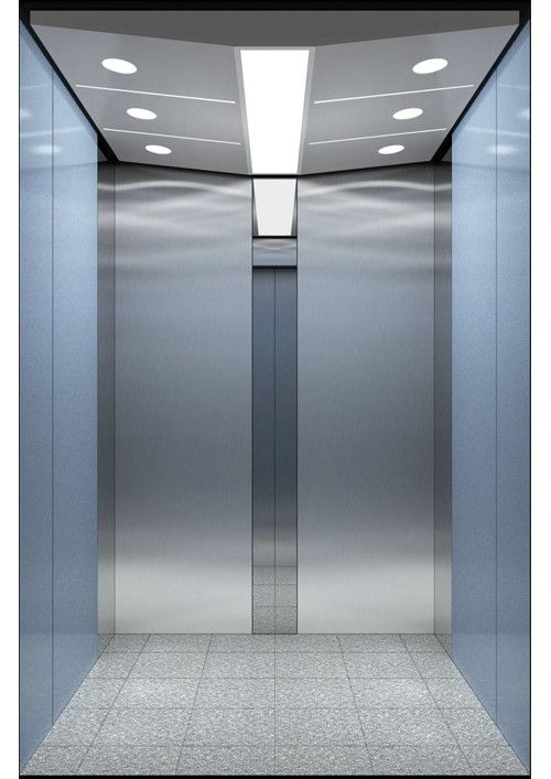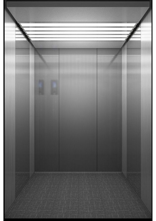 轎廂型號:YG-1623  天井:香檳砂紋板(YG-07)  兩側、后側板:兩側灰色砂紋噴涂鋼板(YG-01)+鏡面不銹鋼,后側麥點布紋彩紋鋼板(HK-03)+鏡面飾條  前側板、門楣:緞紋不銹鋼  轎門:緞紋不銹鋼  地板:FL-P32  操作盤:BD-D2F1