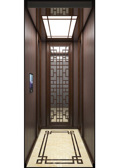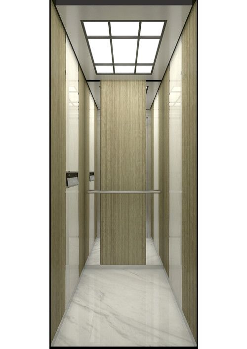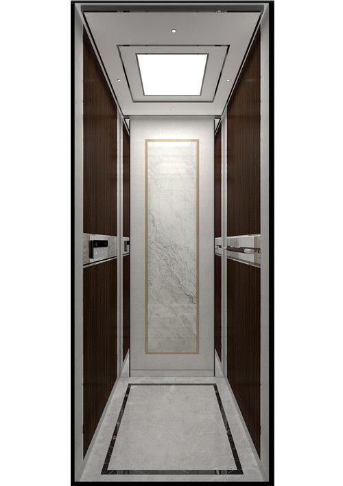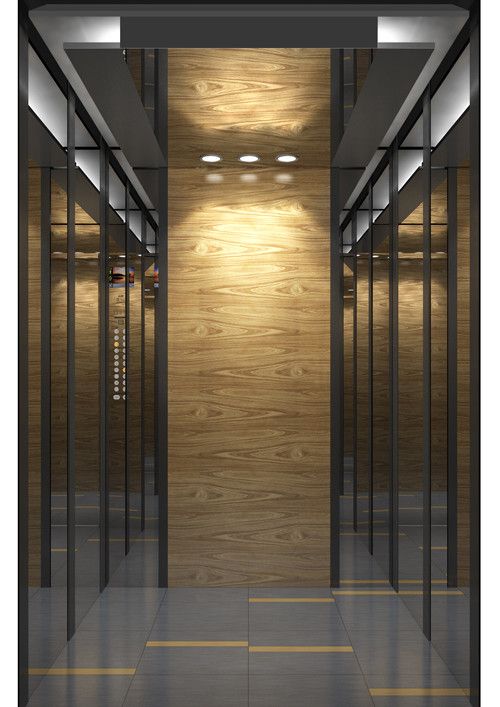 轎廂款型:雅致別院  天井ECO-YZ,鏡面不銹鋼+實木飾條  前側板發紋不銹鋼  門楣發紋不銹鋼  兩側藝術貼膜鋼板WE423(阿拉伯刺槐)+實木線條鏡框+鏡面不銹鋼  后側板藝術貼膜鋼板WE423(阿拉伯刺槐)+實木線條鏡框+鏡面不銹鋼  轎門發紋不銹鋼  操作盤BC-T8A1  踢腳板實木  地板大理石(金線米黃+深啡網)