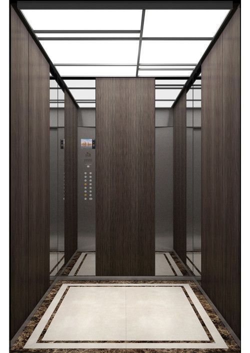 轎廂型號:YG-1632  天井:ECO-CR2金屬烤漆(YM-14)  兩側、后側板:兩側深棕木彩紋鋼板(KB19)+鏡面不銹鋼,后側深棕木彩紋鋼板(KB19)+麥點紋彩紋鋼板(HK03)  前側板、門楣:發紋不銹鋼  轎門:發紋不銹鋼  地板:FL-P31(砂巖米黃PVC)  操作盤:BC-D2F2